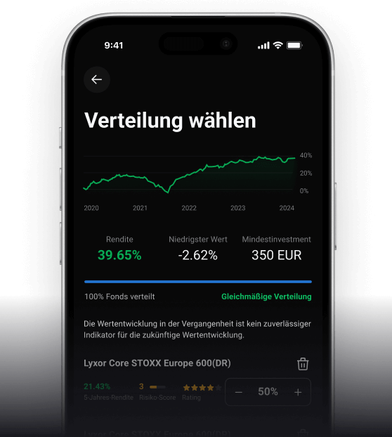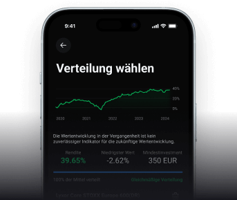 Entdecken Sie die smarte Art, passiv in ETFs zu investieren. Die intuitive Benutzeroberfläche ermöglicht es Ihnen, Ihren eigenen Sparplan zu erstellen und ihn mit automatischen Zahlungen regelmäßig zu befüllen.