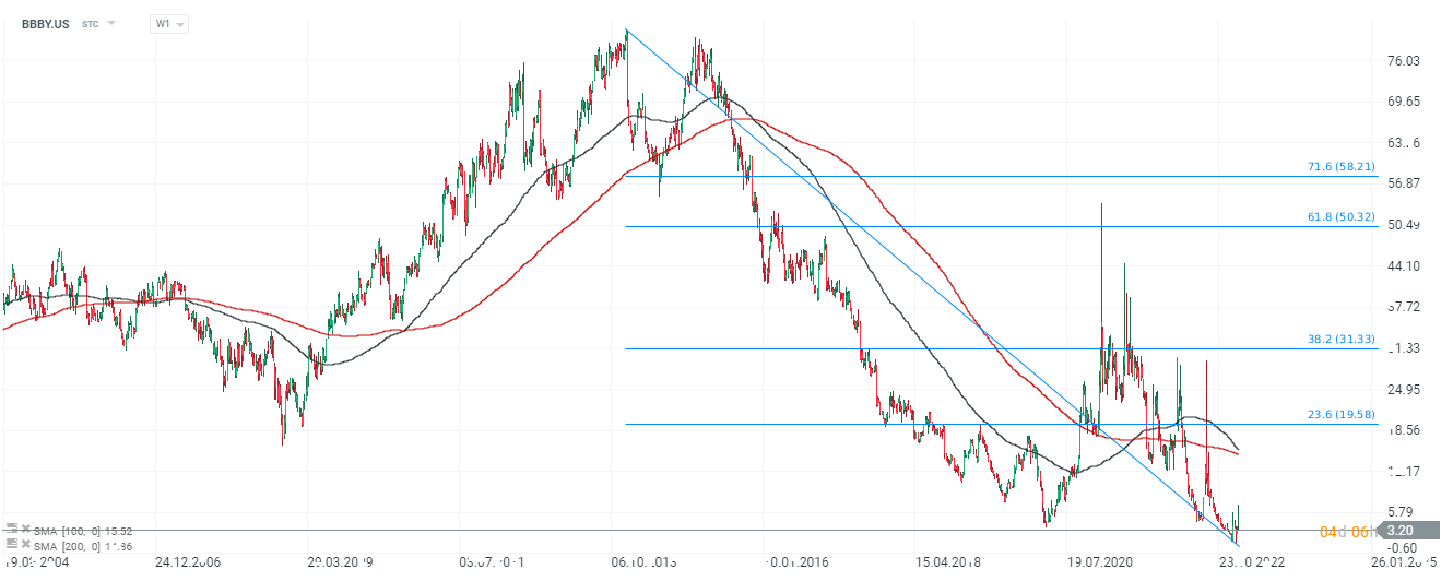 Chart of Bed Bath Beyod (BBBY.US), W1 interval. The SMA200 (red line) and SMA100 (black line) averages are again approaching an intersection that will potentially form a bearish 'death cross' formation. Source: xStation5