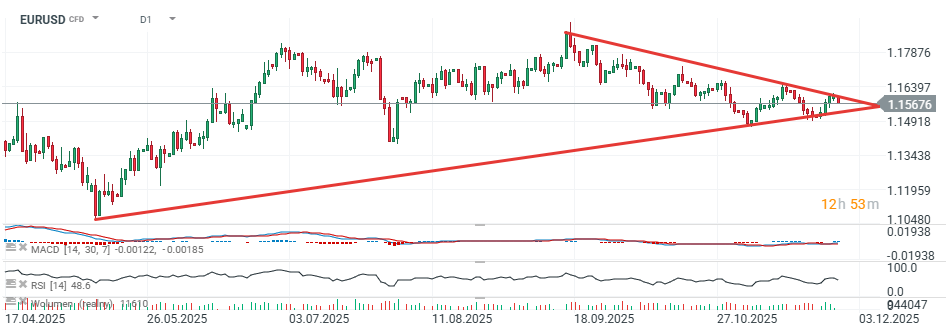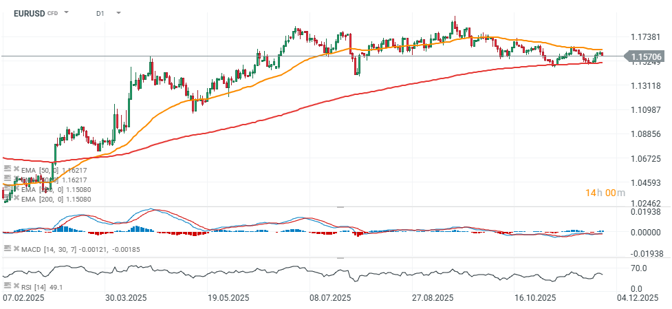 The euro–dollar pair is pulling back slightly after three consecutive days of gains and is currently trading in the mid-range between the EMA200 (red line) and EMA50 (orange line), suggesting investor indecision about the sustainability of the trend, despite rising expectations of a December rate cut, which now stand close to 84%.