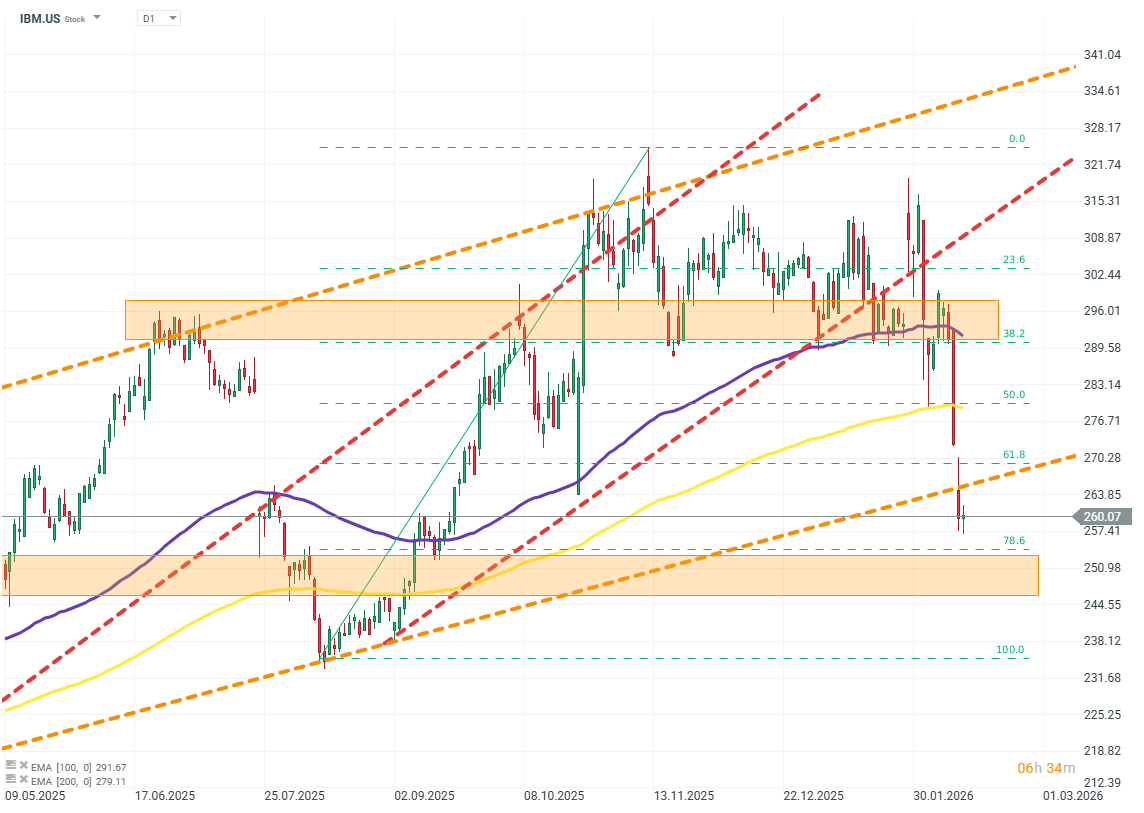 The company has experienced a sharp sell-off despite recently holding near record highs. The EMA structure remains bullish, but a return above the FIBO 61.8 level is key for demand. Source: xStation5