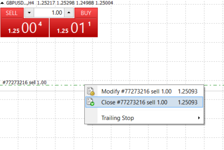 كما ترى فإن فتح واغلاق صفقات التداول أمر سلس للغاية على منصة Mt4 ويستغرق الأمر حرفياً ضغطة واحدة.