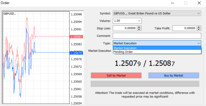 بعد اختيار حجم الصفقة تقوم بتحديد نوع المركز المالي، فإذا كنت تتوقع ارتفاع السوق تقوم بتنفيذ أمر "الشراء" وتضغط على زر "الشراء بسعر السوق" ‘buy by market’، بينما إذا كنت تتوقع انخفاض السوق تقوم بتنفيذ أمر "البيع" وتضغط على زر " البيع بسعر السوق" ‘sell by market’.