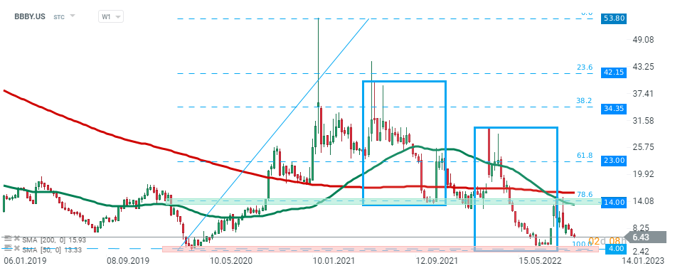انخفضت أسهم Bed Bath (BBBY.US) بنحو 55٪ حتى الآن هذا العام. تمكن المشترون من الدفاع عن الدعم الرئيسي عند 4.00 دولارات ، حيث تقع قيعان الوباء ، ولكن الاختراق فقط فوق المقاومة الرئيسية عند 14.00 دولار قد يؤدي إلى انعكاس الاتجاه. حتى ذلك الحين ، لا يزال الشعور العام هبوطيًا. المصدر: xStation5