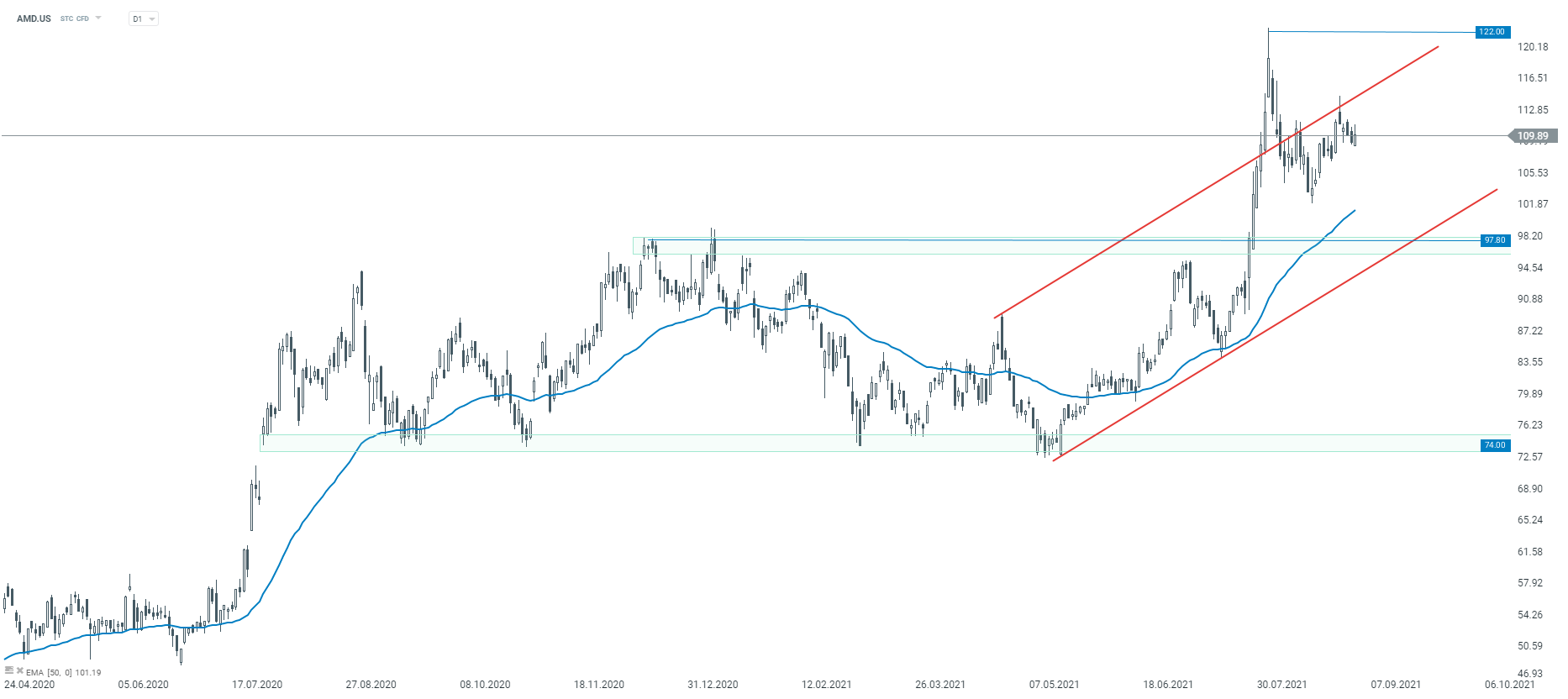 تنتج الشركة مكونات إلكترونية. من بين منتجاتها الرئيسية يمكننا ان نجد المعالجات الدقيقة المتقدمة. أحد المنافسين الرئيسيين للشركة هب شركة التكنولوجيا الأمريكية المعروفة اينتيل. تضاعفت إيرادات اي ام دي في الربع الثاني من عام 2021 مقارنة بالربع الثاني من عام 2020 لتبلغ 3.85 مليار دولار. زادت ربحية السهم من 0.13 دولار إلى 0.59 دولار. كانت النتائج أفضل مما كان متوقعا.