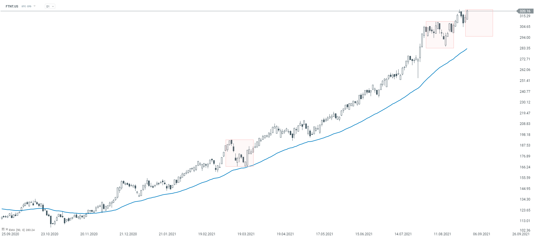 بعد ارتفاع مفاجئ في مطلع يوليو وأغسطس 2021 ، تراجع سعر السهم إلى ما دون الحد الأعلى المكسور سابقًا للقناة الصعودية. ومع ذلك ، لا يزال السهم قريبًا من هذه المقاومة الفنية
