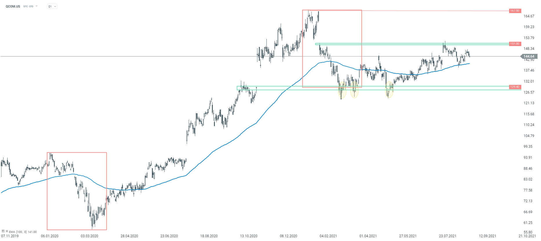 تم تداول في النطاق مؤخرًا. نطاق التداول الواسع للسهم محدود بمنطقة 129.40 دولارًا أمريكيًا على الجانب السفلي ومنطقة 151.00 دولارًا أمريكيًا على الجانب العلوي. اختبر السهم مؤخرًا الحد الأعلى ولكنه فشل في الاختراق فوقه. المصدر: xStation5