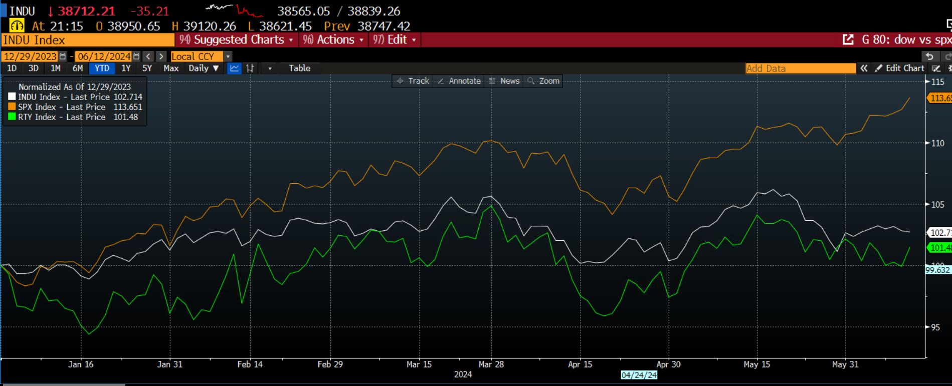 الرسم البياني 2: مؤشر S&P 500 ومؤشر داو جونز الصناعي وRussell 2000، رسم بياني لسنة واحدة تم تطبيعه لإظهار كيفية تحركهم معًا، وكيف يستمر مؤشر S&P 500 في الابتعاد عن المؤشرات الأمريكية الأخرى.