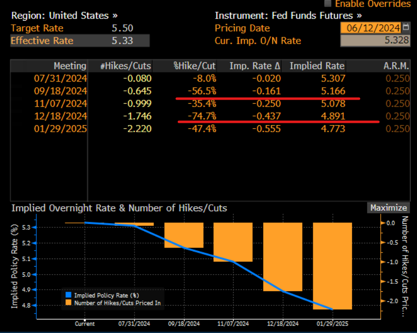 لقد انتهى اجتماع بنك الاحتياطي الفيدرالي لمدة شهر آخر. لقد سار الأمر في الغالب كما هو متوقع، وبقيت أسعار الفائدة دون تغيير، وأشار بيان اللجنة الفيدرالية للسوق المفتوحة إلى أن بنك الاحتياطي الفيدرالي سعيد بالتوقعات الاقتصادية، بل واعترفوا بالتقدم المحرز بشأن التضخم بعد تقرير مؤشر أسعار المستهلك اليوم الأقل من المتوقع لشهر مايو. وكما كان متوقعا، تراجع بنك الاحتياطي الفيدرالي عن توقعاته بشأن تخفيضات أسعار الفائدة المدرجة في مخطط Dot Plot. ويبلغ متوسط التوقعات لأسعار الفائدة لهذا العام 5.1%، ارتفاعًا من 4.6% في مارس. تحولت التوقعات السابقة لثلاثة تخفيضات في أسعار الفائدة هذا العام إلى ما يزيد قليلاً عن خفض واحد.