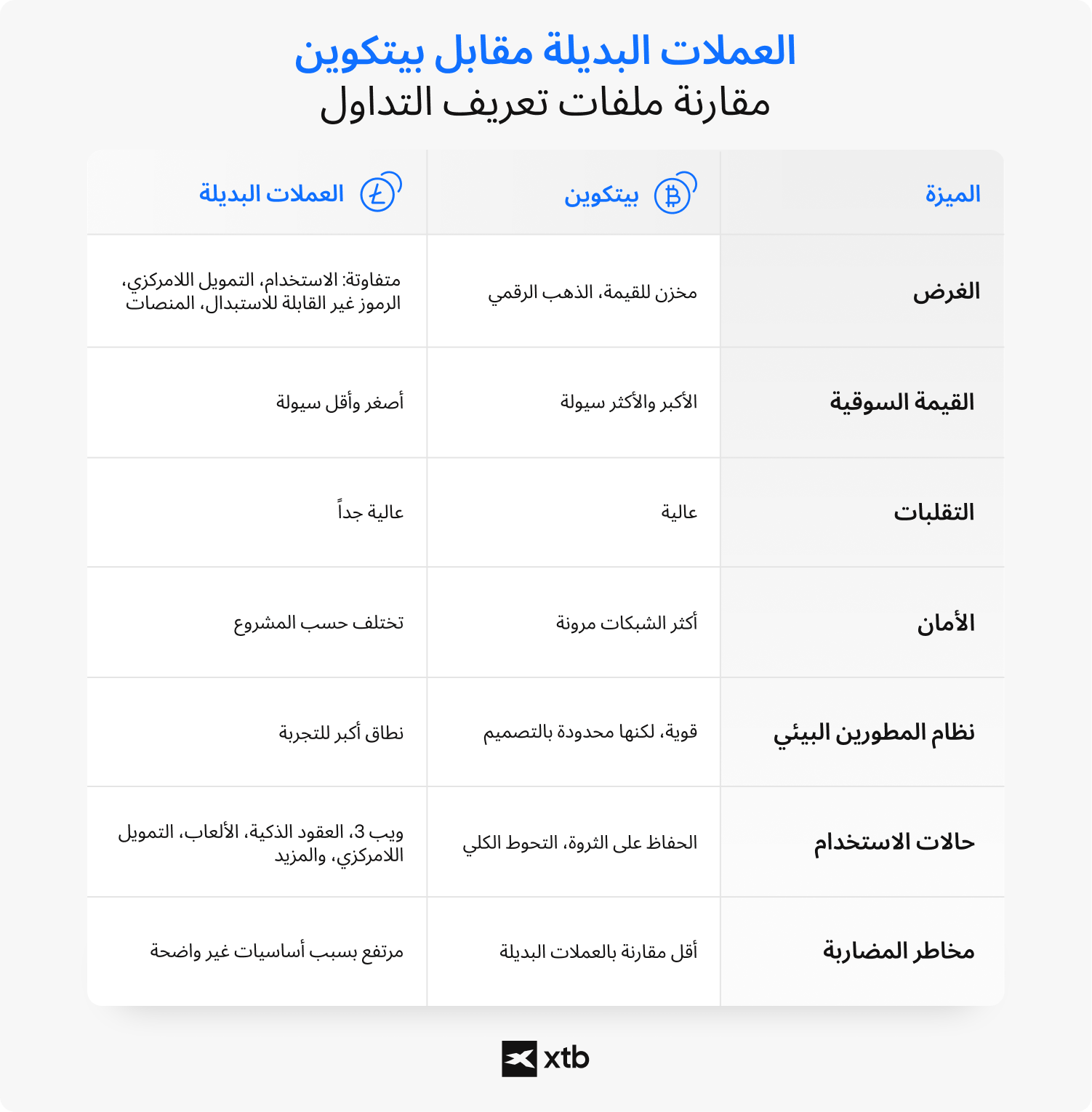 - يمكن أن يوفر تداول العملات البديلة تقلبات أعلى، ابتكاراً أكبر، و تعرضاً متنوعاً لسلاسل الكتل (بلوكشين)، و لكنه ينطوي أيضاً على مخاطر مرتفعة.