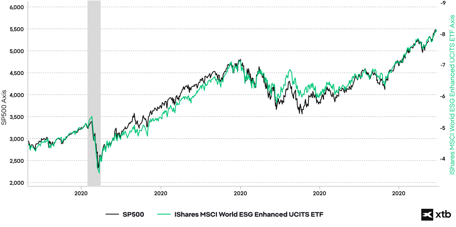 بين 2019 إلى 2024 كان الأداء الإستثماري لأسهم صندوق الإستثمار المتداول ESG لشركة مورغان ستانلي العالمية (MSCI) جيداً تماماً مثل مؤشّر أس أن بي 500. الأداء السابق لا يمكن أن يضمن النتائج المستقبلية. المصدر: أبحاث XTB.