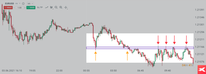 ونجد الوضع ذاته في الاتجاه الهبوطي أيضًا. في حالة اخترق السعر أدنى انخفاض أخير (القاع المحلي)، فإن هذا المستوى يجب أن يكون بمثابة مقاومة في المستقبل. يتضح هذا في المثال أدناه.