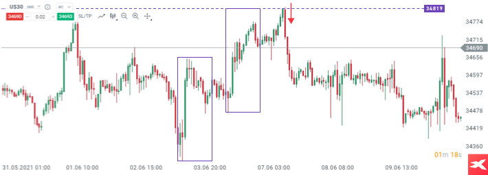 إذا كانت لدينا صفقات طويلة (شراء) في محفظتنا وكان السوق يتفاعل مع الحد الأعلى لهيكل 1: 1 الناتج عن الدافع الصعودي السابق، فيمكن استخدام هذا المستوى لحجز الأرباح أو الإغلاق الجزئي للصفقة. غالبًا ما يمكن تحديد الحدود المتطرفة المحلية بمساعدة الهندسة، والتي تكون مفيدة بشكل خاص في التداول اليومي.