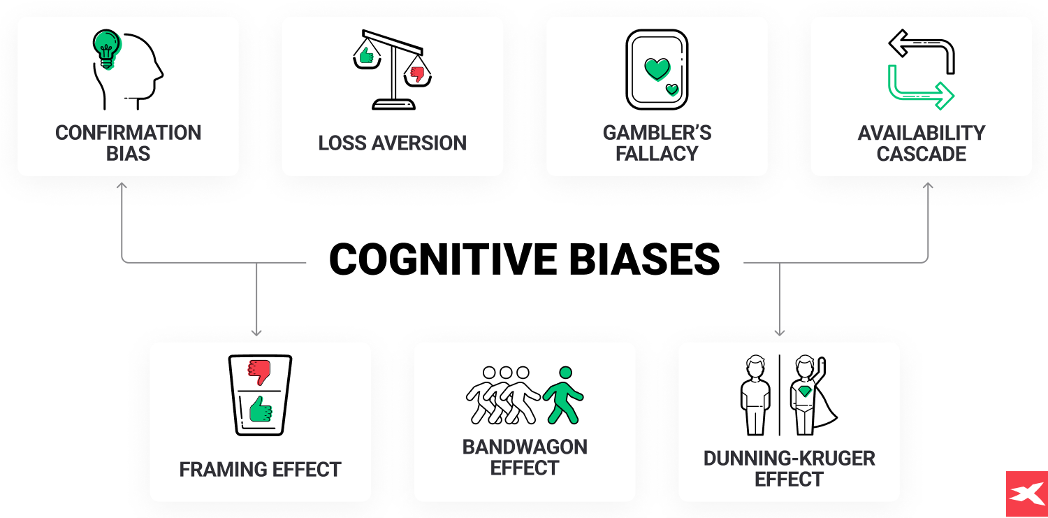 التحيزات المعرفية هي المخرب الصامت للتفكير العقلاني، والتي تقود المستثمرين بشكل منهجي إلى تضليل حكمهم. وتتجلى في أشكال مختلفة، بما في ذلك: