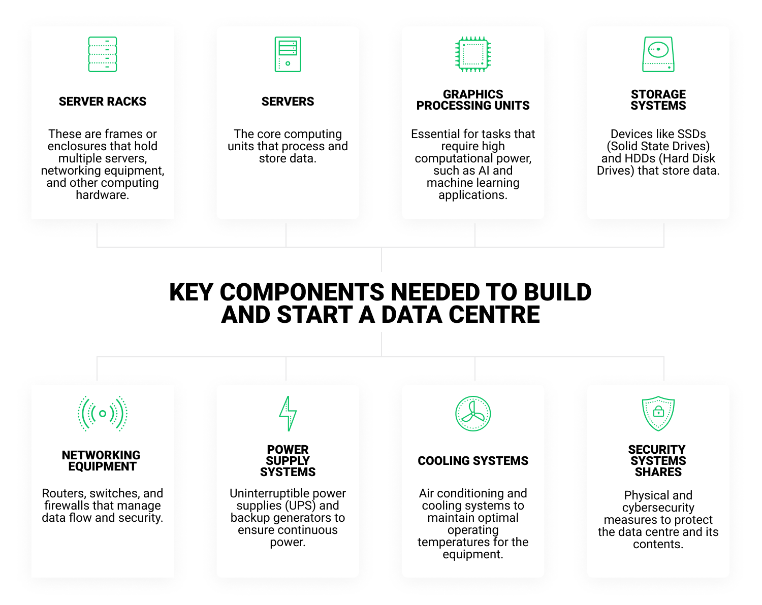 يتضمن الاستثمار في مراكز البيانات فهم المكونات الأساسية اللازمة لبنائها وتشغيلها، بما في ذلك رفوف الخوادم ووحدات معالجة الرسومات (GPU) وغيرها من الأجهزة.