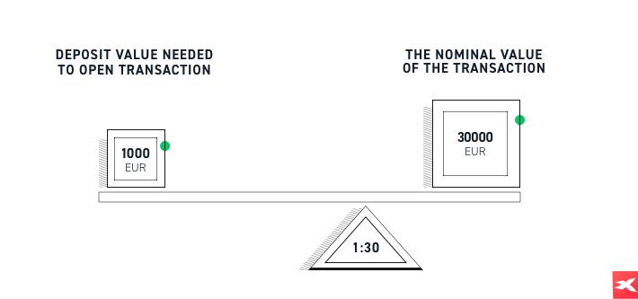 دعونا نعود إلى الهامش الذي يعد عنصرًا أساسيًا في الاستثمار بالرافعة المالية. يُعرف أيضًا باسم هامش الإيداع. من أجل التحكم في صفقة بقيمة 30.000 يورو برافعة مالية عند 1:30، يجب أن تضع جانبًا 1.000 يورو. هذا يعني أنه يمكنك التحكم في 30.000 يورو بـ 1000 يورو فقط، ويتم وضع 1000 يورو جانباً كهامش تم إنشاؤه لك لاستخدام الرافعة المالية.