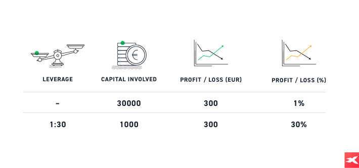 لولا الرافعة المالية عند 1:30، لكان على المتداول الحصول على 30.000 يورو في الحساب ونفس الربح المحتمل البالغ 300 يورو سيعني معدل عائد يساوي 1٪. بفضل الرافعة المالية، يمكن أن تكون معدلات العائد على الاستثمارات أعلى مع انخفاض المساهمات المالية الخاصة. ومع ذلك تعتبر الرافعة المالية سيف ذو حدين. في حالة انخفاض سعر الصرف ونتيجة الصفقة كانت 300 يورو، يخسر المتداول 30٪ ولن يتبق سوى 700 يورو من قيمة 1.000 يورو.