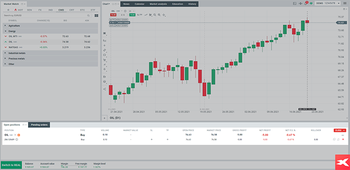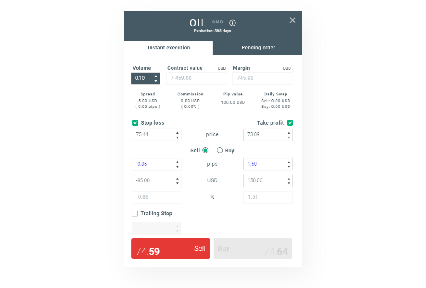 أسهل طريقة للتداول في سوق النفط هي استخدام منصتنا XTB للتداول، وهي منصة تداول كاملة تمنحك الفرصة للاستثمار في مجموعة واسعة من الأدوات المالية. بفضل الآلة الحاسبة المتوفرة على نافذة الطلب، يمكنك تعيين أمر إيقاف الخسارة أو جني الأرباح وفقًا للافتراضات الناتجة عن استراتيجية الاستثمار الخاصة بك.