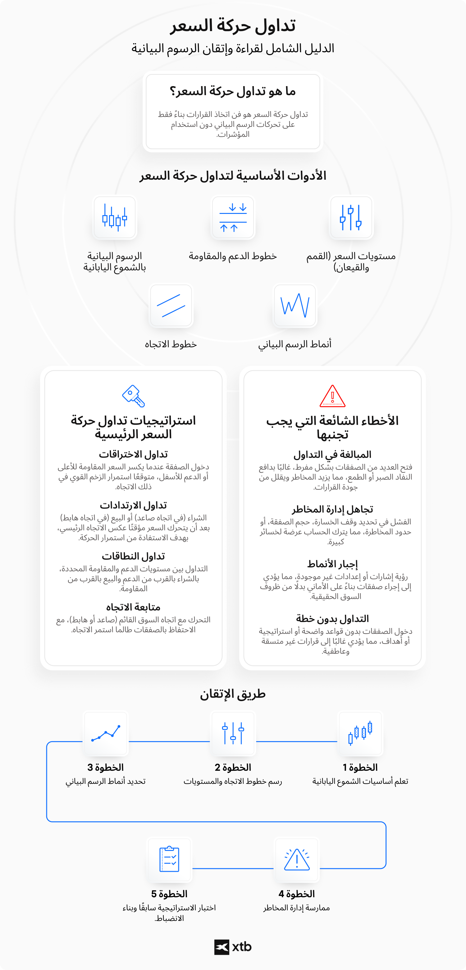 - تشمل الأدوات الرئيسية للتداول بحركة السعر مخططات الشموع اليابانية، خطوط الاتجاه، و مستويات الدعم و المقاومة، و التي تساعد المتداولين على تحديد نقاط الدخول و الخروج المحتملة لصفقاتهم.