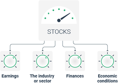 الظروف الاقتصادية – أسعار الأسهم تتحدد وفقاً لما يجري داخل الشركة وأيضاً وفقاً لما يجري خارج الشركة في الاقتصاد ككل، ففي حالة تراجع معدلات النمو على سبيل المثال أو في حالات الركود فقد يعني هذا تراجع أرباح الشركة أو تعرضها للإفلاس وهو ما قد يؤثر بشكل سلبي على أسعار أسهم هذه الشركة، وفي المقابل نجد أن التحسن الكبير في معدلات النمو قد يؤثر بشكل إيجابي على النظرة المستقبلية للشركة وبالتالي يدفع أسعار الأسهم إلى الارتفاع.