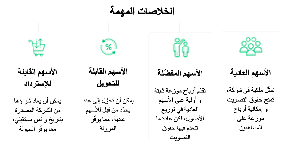 يفتح الإستثمار في سوق الأسهم عالماً من الفرص، و فهم أهم أربع أنواع من الأسهم يمكن من المساعدة في بناء محفظة متينة. توفّر الأسهم العادية الملكية و حقوق التصويت، مما يسمح لك بالحصول على رأي في مستقبل الشركة بينما تستمتع بامكانية النمو و الأرباح الموزّعة. تمنح الأسهم المفضلة عوائد ثابتة و أولوية في توزيع الأصول، ما يجعلها مصدر دخل موثوق مع اضطراب قليل. تمزج الأسهم القابلة للتحويل أحسن ما في العالمَين، إذ توفّر عائداً ثابتاً مع المرونة في تحويلها لأسهم عادية لزيادة رأس المال. تمنح الأسهم القابلة للإسترداد عائداً مضموناَ و خيارَ إعادة الشراء، ضامنة السيولة عندما تكون في حاجتها أكثر. بإتقان هذه الركائز الأربعة، يمكنك أن تخيط استراتيجية استثمارك لتطابق أهدافك المالية و قابلية المخاطرة لديك، ممهداً طريقك لمستقبل ماليٍ باهر.
