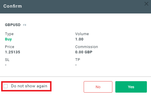 قد تظهر في البداية نافذة تأكيد ويمكنك اختيار “لا تظهر مرة أخرى" ‘don’t show again’ حتى لا تظهر هذه الرسالة في المستقبل، وبالتالي تستطيع أن تفتح الصفقات بشكل سريع من ضغطة واحدة.