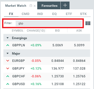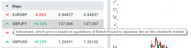 كل الأدوات المالية المتاحة للتداول لديها رموزها الخاصة بها – فإذا لم تكن متأكداً من معنى الرمز يمكنك تمرير مؤشر الماوس فوق الرمز ليظهر المزيد من المعلومات عن الأداة المالية.