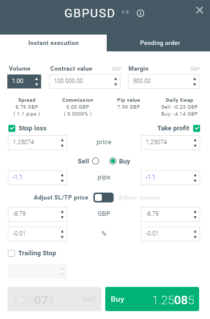لنفترض أنك ترغب في فتح صفقة تداول على زوج الجنيه الإسترليني مقابل الدولار الأمريكي بقيمة عقد واحد (1 لوت). فستقم بتحديد حجم الصفقة باستخدام حاسبة التداول المدمجة.