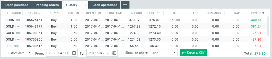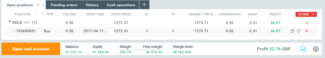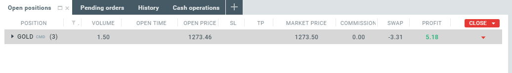 التبويب الأول يسمى "فتح الصفقات" ‘Open positions’، وفيه تجد بالتفصيل جميع صفقات التداول المفتوحة.