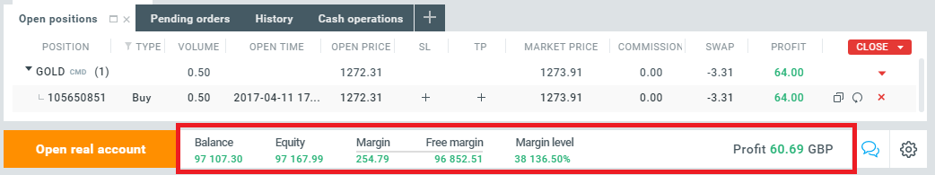 - الرصيد المتاح: رصيد حسابك بالإضافة إلى الربح / الخسارة للصفقات المفتوحة