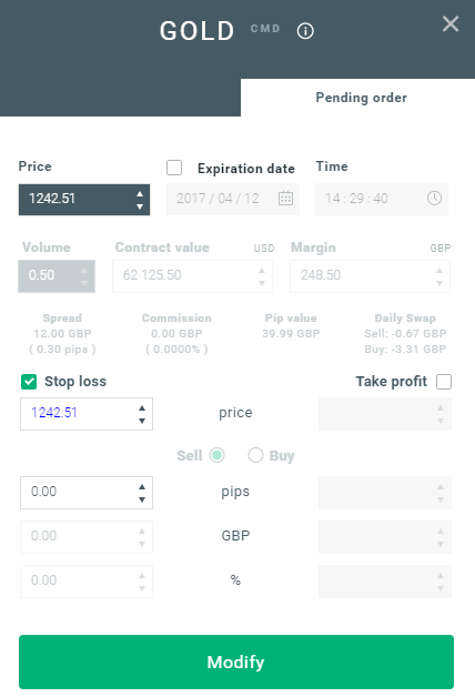 من خلال هذه النافذة يمكنك استعراض كافة المعلومات حول الأوامر المعلقة تمامًا كما في تبويب المراكز المفتوحة، ولتعديل أمر معلق بعينه تقوم بالضغط المزدوج عليه (أو الضغط بزر الماوس الأيمن ثم اختار "تعديل" "Modify") وستظهر نافذة جديدة.
