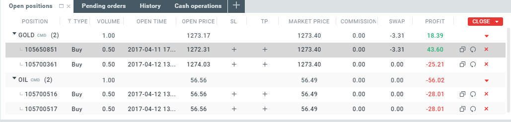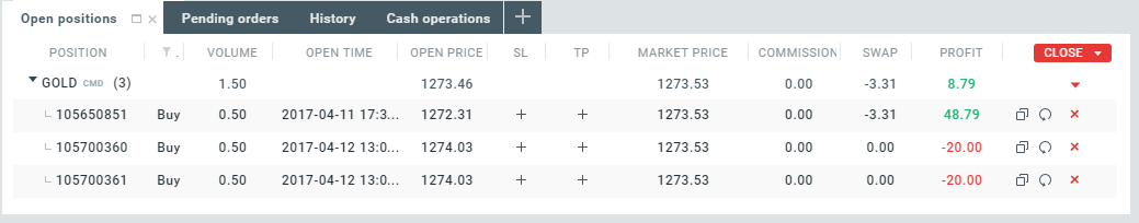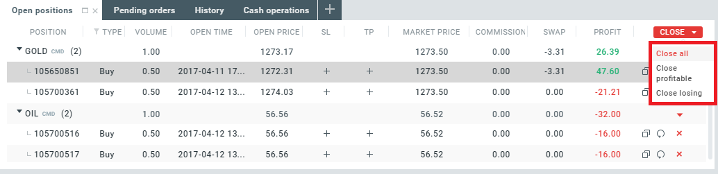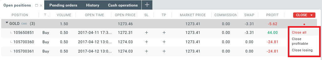 يمكنك إغلاق صفقات تداول متعددة بضغطة واحدة فقط من خلال الضغط على السهم الأحمر على خط المجموعة، كما يمكنك الاختيار بين "إغلاق الكل" ‘Close all’ أو "إغلاق الصفقات الرابحة فقط" ‘Close profitable trades only’ أو "إغلاق الصفقات الخاسرة فقط" ‘Close losing trades only’.