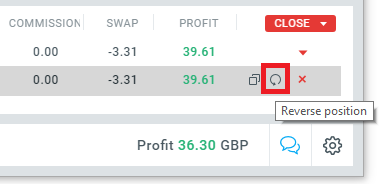 سيتم فتح مركز مالي جديد بسعر السوق الحالي، يمكن أيضاً عكس صفقة التداول من خلال الضغط مرة واحدة على زر "عكس الصفقة" ‘Reverse position’