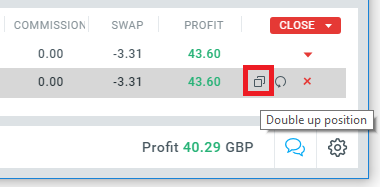 يمكن مضاعفة كل صفقة تداول مفتوحة بالضغط مرة واحدة على أيقونة "مضاعفة الصفقة" ‘double position’: