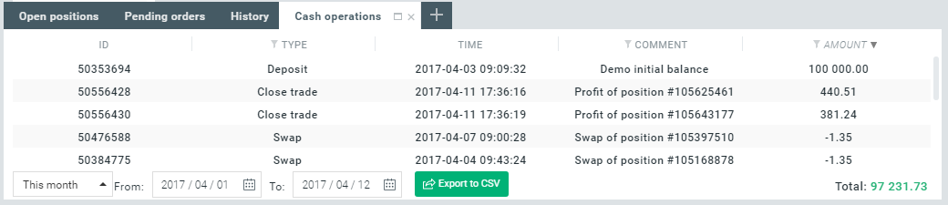 يحتوي تبويب المعاملات النقدية على جميع المعلومات المتعلق بالصفقات التي تم غلقها، والعمولات المحتسبة، والإيداعات والمسحوبات من حسابك. كما يمكنك تصدير سجل المعاملات النقدية إلى ملف اكسيل (Excel).