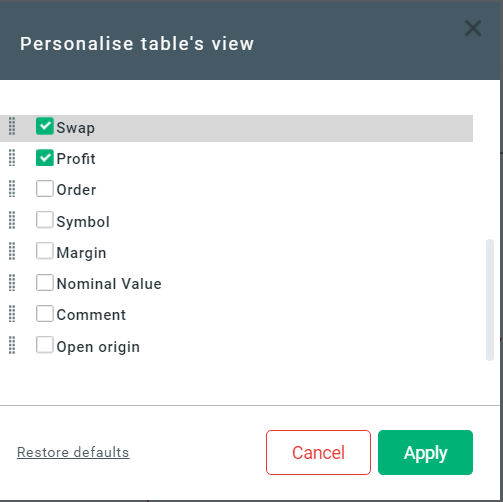 من خلال منصة xStation 5 يمكنك تغيير ترتيب الأعمدة لتناسب تفضيلاتك، وذلك من خلال سحب وافلات العمود الذي ترغب في تحريكه إلى اليمين أو اليسار في تبويب "الصفقات المفتوحة" ‘Open positions’.
