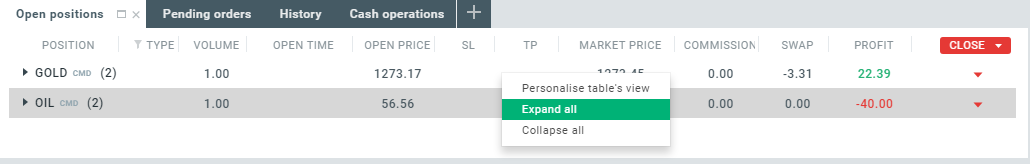 إذا كان لديك أكثر من صفقة على نفس الأداة المالية فسيتم تجميعها معاً، وبالضغط على سطر الصفقات المفتوحة يمكنك اظهار تفاصيل جميع العناصر في المجموعة أو اخفائها.