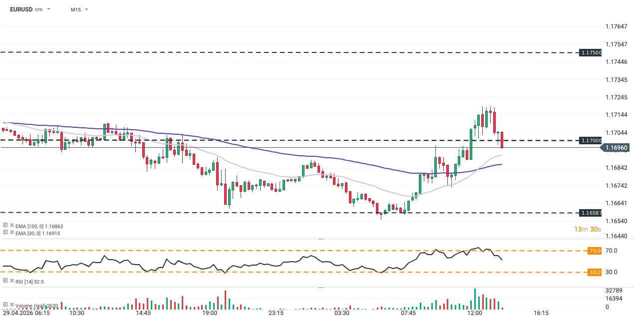 وفي أسواق العملات، أظهر زوج اليورو/الدولار حساسية فورية للأخبار، حيث اختبر المتوسط المتحرك الأساسي لفترة 30 (باللون الأرجواني الفاتح) على إطار زمني 15 دقيقة. ومع ذلك، سرعان ما ارتد الزوج من مستوى الدعم الفني هذا، ويتداول حاليًا بالقرب من مستوى 1.1700 النفسي.