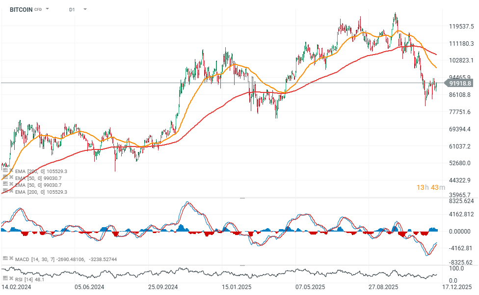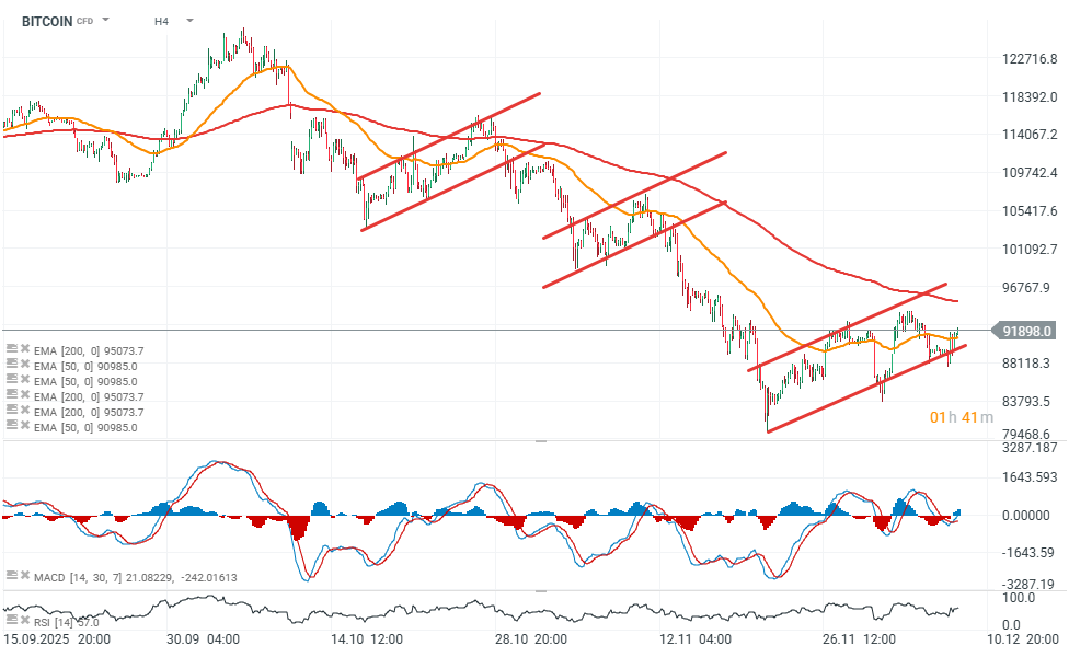 يتعافى سعر البيتكوين اليوم بعد انخفاضات كبيرة، ويشكل الرسم البياني قيعانًا مرتفعة بشكل متزايد، مما قد يشير إلى محاولة للعودة إلى اتجاه تصاعدي. تقع مستويات المقاومة الرئيسية حاليًا حول 93,000 دولار أمريكي و100,000 دولار أمريكي، حيث نجد أيضًا EMA50 (الخط البرتقالي).