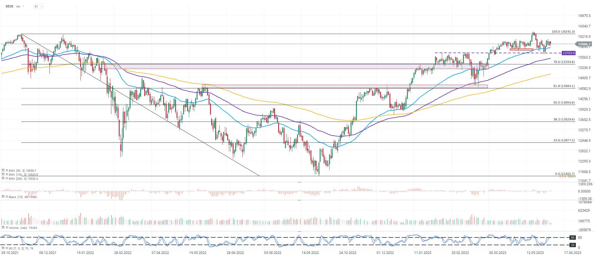 يتم تداول العقود الآجلة القائمة على مؤشر DAX الألماني (DE30) بانخفاض اليوم وتحاول اختراق المنطقة الدنيا للجلسة الماضية. في الوقت الحالي ، لا يزال جانب الطلب يدافع فوق الدعم المحدد بواسطة EMA 50 (المنحنى الأزرق ، الفاصل الزمني D1). المصدر: xStation 5