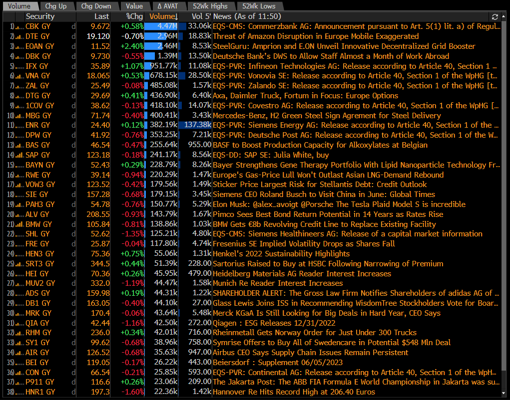 التغييرات الرئيسية في النسبة المئوية والمعلومات من الشركات الفردية في مؤشر DAX. المصدر: بلومبرج
