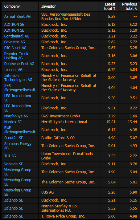 التغييرات في المقتنيات المؤسسية في شركات مؤشر DAX الفردية (بيانات الجلسة الأخيرة). المصدر: بلومبرج