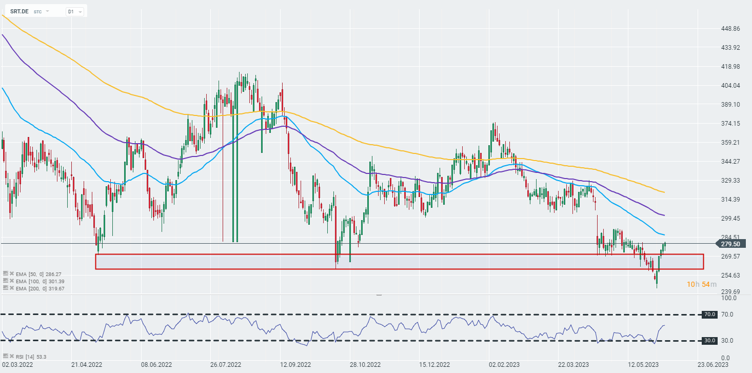 مخطط سهم سارتوريوس (SRT.DE) ، الفاصل الزمني D1. تمكنت أسهم الشركة الألمانية من الاختراق فوق منطقة الدعم (الموضحة على الرسم البياني) ، والتي كانت قد وصلت إلى القاع سابقًا ، وتقوم حاليًا باختبار المقاومة التي حددها EMA 50 (المنحنى الأزرق). المصدر: xStation5