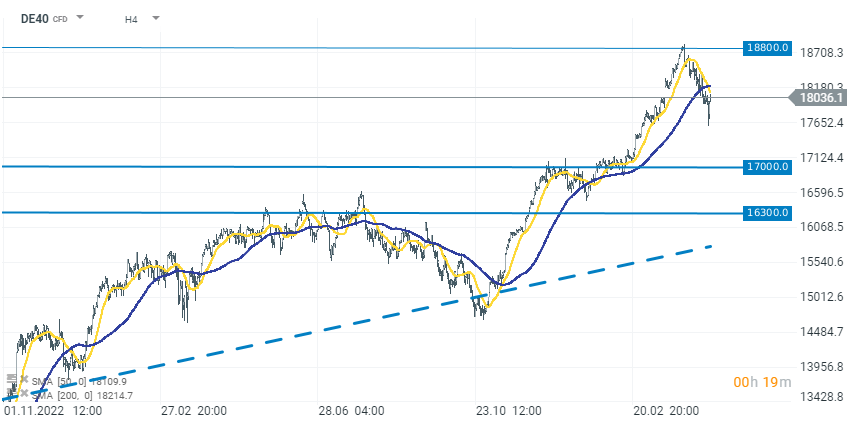 The German benchmark DE40 records a 0.70% increase during today's session, thus returning above the 18,000 points level. At the time of publication, the bulls are dealing with a resistance line around 18,100-18,150 points, which was determined by the 50-day SMA.