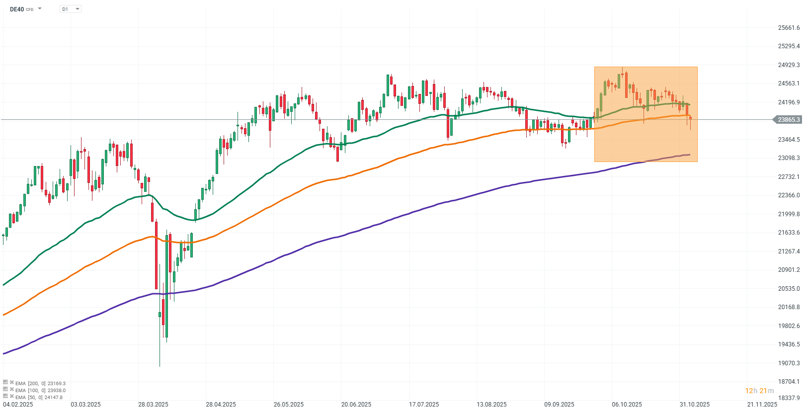 في الأسابيع الأخيرة، تباطأ مؤشر DE40 (مؤشر داكس الألماني) في ارتفاعه ودخل في مرحلة تصحيح، متراجعًا عن المتوسط المتحرك الأساسي قصير الأجل (50) ومختبرًا دعم المتوسط المتحرك الأساسي (100). فقد السوق بعض مكاسبه من ذروة أكتوبر، لكنه لا يزال فوق المتوسط المتحرك الأساسي طويل الأجل (200)، مما قد يشير إلى استقرار. يُظهر هذا الوضع أن المستثمرين يتوخون الحذر بعد المكاسب السريعة، وينتظرون الآن دوافع اقتصادية كلية جديدة ونتائج أعمال الشركات.