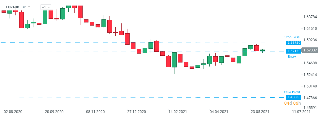 يوصي بنك كريدي أجريكول ببيع زوج EURAUD بسعر1.5715 و استهداف 1.4800 و وضع أمر وقف الخسارة عند 1.5875. المصدر: xStation5