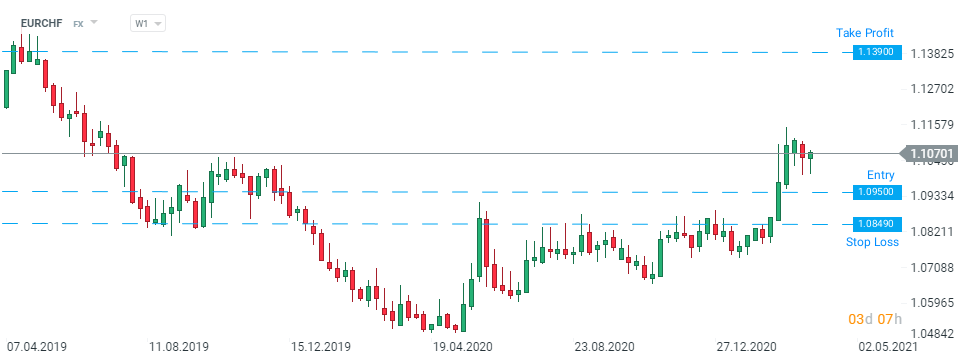 يوصي بنك كريدي سويس بصفقة شراء معلقة على زوج EURCHF وتحديد حد الشراء عند 1.0950 الهدف عند 1.1390 ووضع أمر وقف الخسارة عند 1.0849. المصدر: xStation5