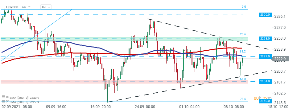 كسر US2000 ما دون الدعم المحلي عند 2227 نقطة والذي يتزامن مع 100 EMA (الخط البنفسجي) خلال جلسة الأمس ، ومع ذلك تمكن المشترون من وقف الانخفاض عند الحد الأدنى لتشكل المثلث. يحاول المؤشر حاليًا إعادة اختبار مستوى 2227 نقطة والذي يعمل الآن كمقاومة. في حالة حدوث اختراق أعلى ، قد تتسارع الحركة الصعودية نحو المقاومة التالية عند 2258 نقطة والتي تتزامن مع الحد الأعلى لتشكيل المثلث. المصدر: xStation5