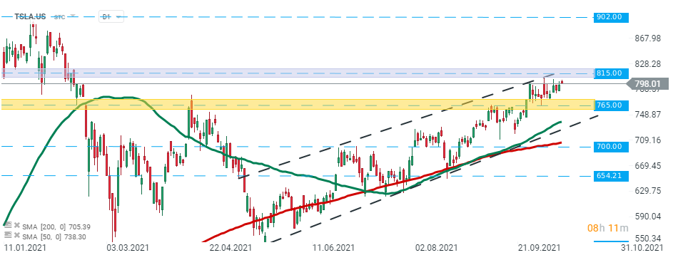 أطلقت Tesla (TSLA.US) جلسة اليوم على ارتفاع طفيف بعد أن أعلنت الشركة عن مبيعات في الصين أفضل من المتوقع. يتجه السعر حاليًا نحو المقاومة عند 815.00 دولارًا والتي تتزامن مع الحد الأعلى للقناة الصاعدة. وفي حالة حدوث الاختراق إلى مستوى أعلى ، فقد تتسارع الحركة الصعودية نحو أعلى مستوى على الإطلاق عند 902.00 دولار أمريكي. ولكن في حال تمكن البائعون من استعادة السيطرة ، فقد يكون الدعم المحلي عند 765،00 دولار في خطر. المصدر: xStation5