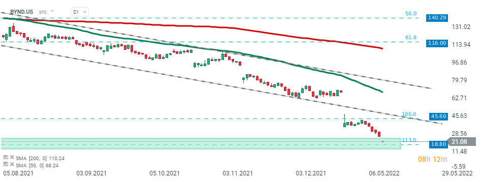 أطلق سهم Beyond Meat (BYND.US) جلسة اليوم بفجوة سعرية هبوطية ويختبر حاليًا الدعم حول 18.80 دولار والذي يتزامن مع ارتداد فيبوناتشي الخارجي بنسبة 113٪ للموجة الصعودية التي تم إطلاقها بعد الاكتتاب العام الأولي للشركة. في حالة حدوث الاختراق الأدنى ، من الصعب الإشارة إلى أي دعم قوي حيث سيدخل السعر منطقة مجهولة. المصدر: xStation5