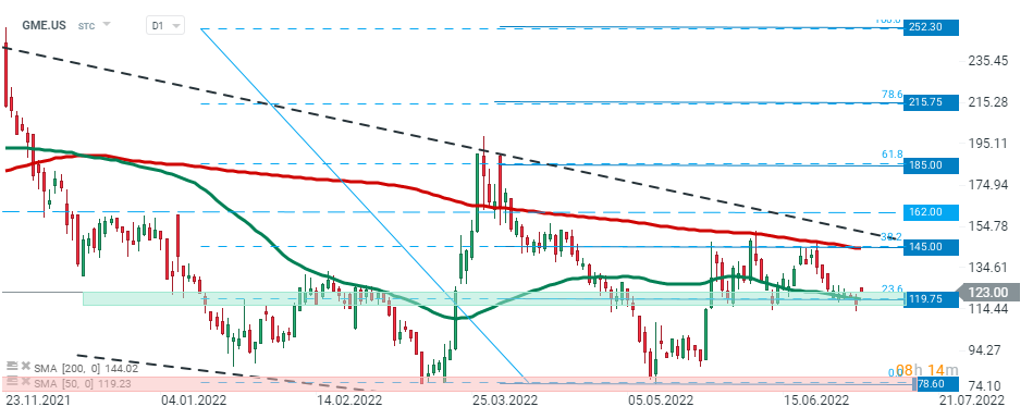أطلق سهم GameStop (GME.US) جلسة اليوم بفجوة سعرية صعودية فوق المقاومة الرئيسية عند 119.75 دولار. إذا سادت معنويات متفائلة ، فقد تكون المقاومة التالية عند 145.00 دولار في خطر. المصدر: xStation5